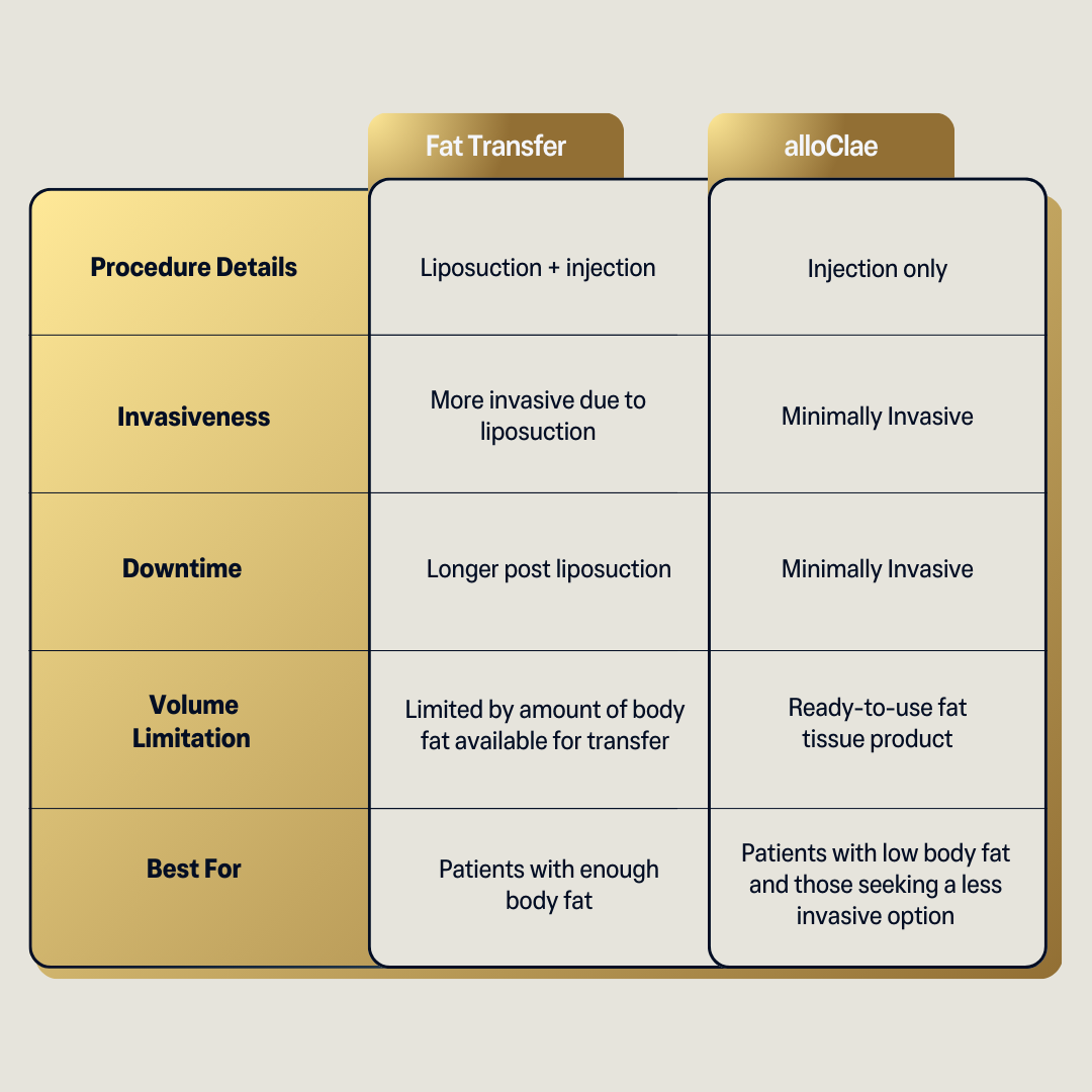 Here is a thoughtful comparison of fat transfer and alloClae™ created with your needs in mind so that you can make your decision with confidence.